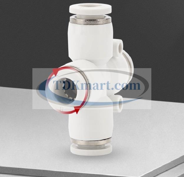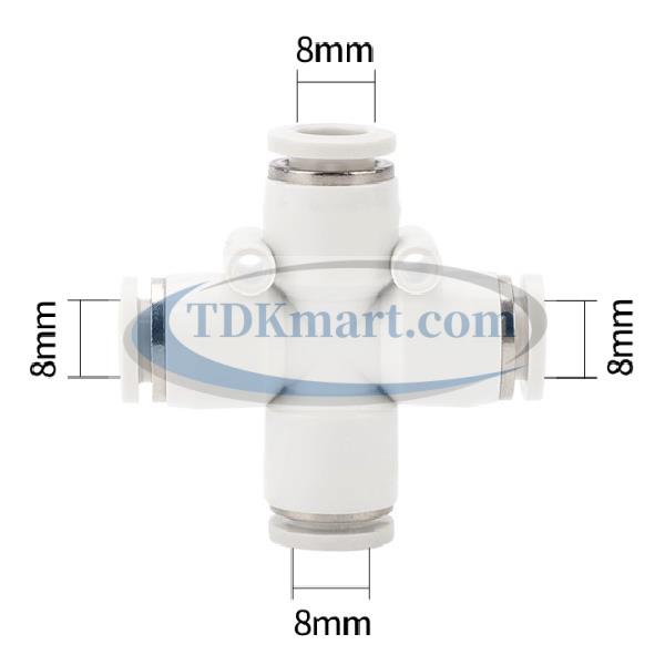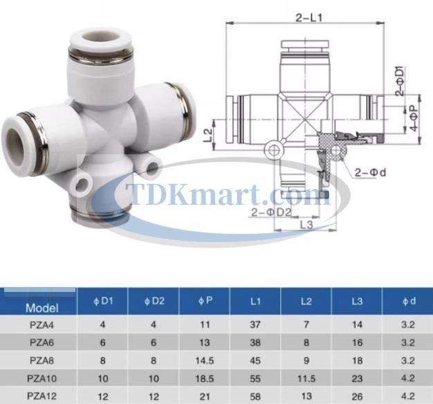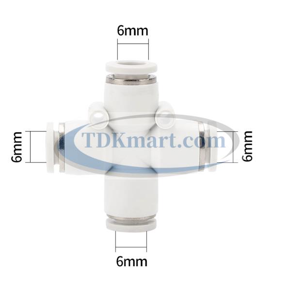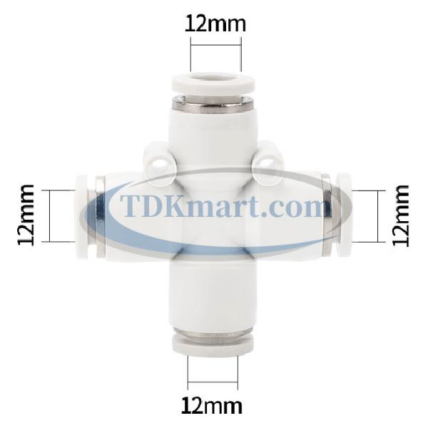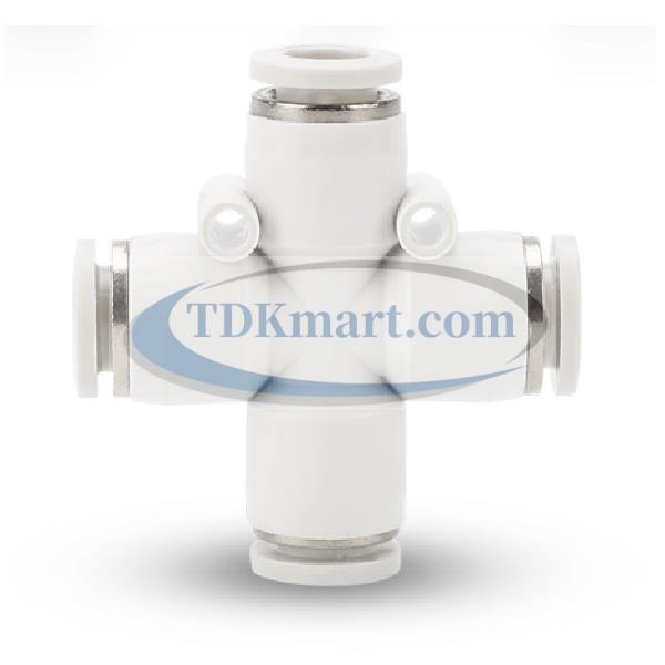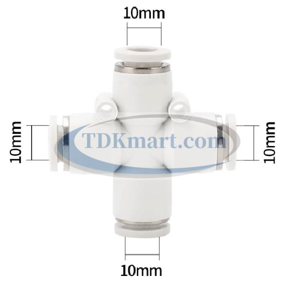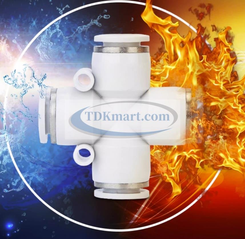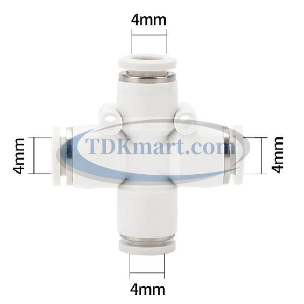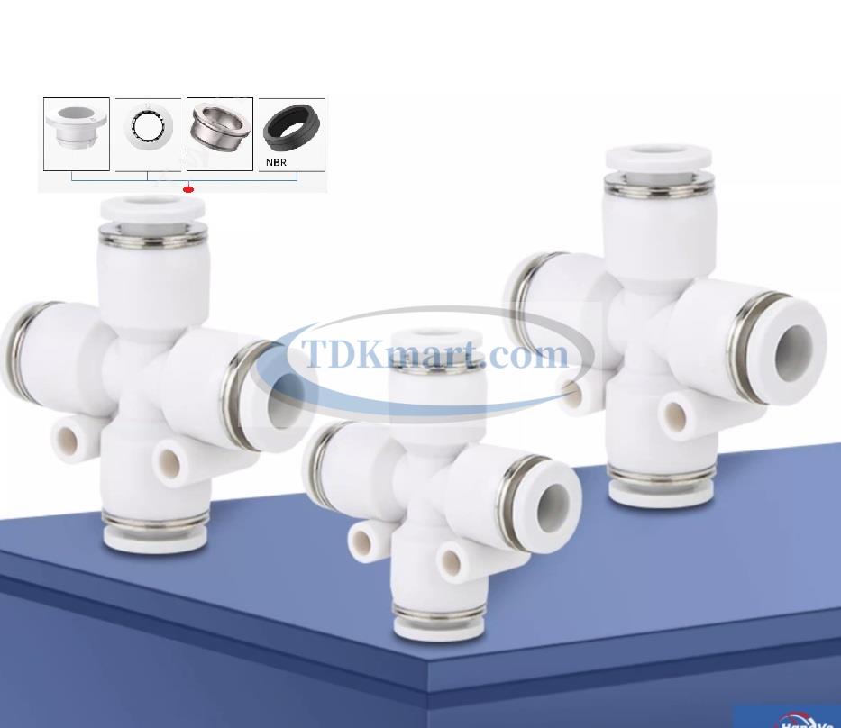 Đầu nối nhanh khí nén chia 4 ngã màu trắng với 4 đầu ghim ống, chất liệu nhựa bền bỉ, lắp đặt nhanh chóng, đảm bảo kín khí và hiệu suất cao cho hệ thống khí nén công nghiệp và gia đình.